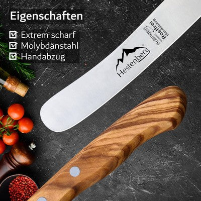 Die Küchenmesser mit echten Olivenholzgriffen von HESTENBERG Solingen sind die perfekten Werkzeuge für Profis und Hobbyköche, die höchste Ansprüche an Qualität und Leistung stellen. Hergestellt in Solingen, der berühmten Stadt der Klingenherstellung, bieten diese Messer eine unübertroffene Schärfe und Präzision.