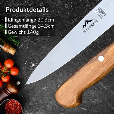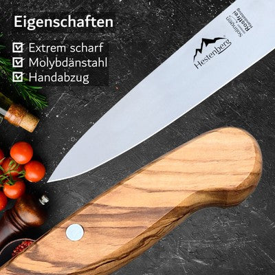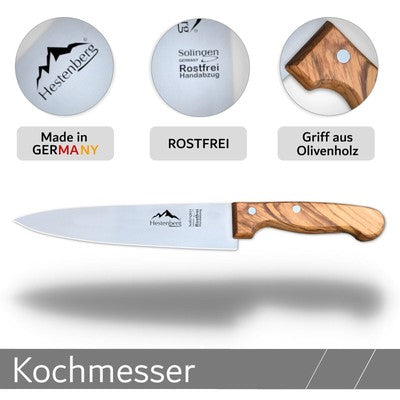 Die Küchenmesser mit echten Olivenholzgriffen von HESTENBERG Solingen sind die perfekten Werkzeuge für Profis und Hobbyköche, die höchste Ansprüche an Qualität und Leistung stellen. Hergestellt in Solingen, der berühmten Stadt der Klingenherstellung, bieten diese Messer eine unübertroffene Schärfe und Präzision.